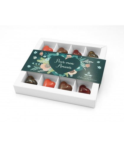 Om Valentijn te vieren met verfijning, brengt deze box 16 chocoladehartjes samen, gecreëerd door vier uitzonderlijke artisanale chocolatiers. Elke creatie is een smaakverklaring, een emotie om te delen… of om heerlijk voor jezelf te houden.